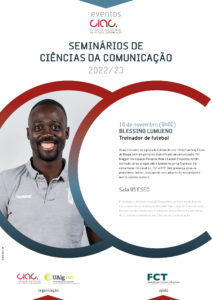 On 18 November 2022, at 9h45, CIAC and the Higher School of Education and Communication (ESTEC- UAlg) promote a seminar about Sports Communication with Blessing Lumueno. The event is organized within the scope of the discipline of Sports Communication as part of the Communication Sciences Degree. The session will be moderated by Prof. Joana Palminha and takes place in ESEC’s room 95.