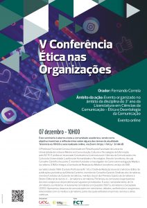 Tomorrow, 7th of December, at 10am, the School of Education and Communication (ESEC) of the University of Algarve and CIAC promote the V Conference on Ethics in Organizations, with journalist and professor Fernando Correia. Organized within the scope of the 3rd year course unit Ethics and Deontology of Communication, the session will take place online, via Zoom.