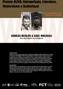 On 25 November 2022, at 18h00 (Lisbon time), the project ALMA – Antropofagia, Literatura, Modernismo e Audiovisual promotes its sixth (and last) conference of a series dedicated to anthropophagic thinking. “Antropofagias Tecnológicas ” [Technological Anthropophagies], the debate panel will be attended by directors Charles Bicalho and Isael Maxacali; and moderated by Jorge Carrega (CIAC/UAlg) and Cláudio Santos Rodrigues (UEMG).