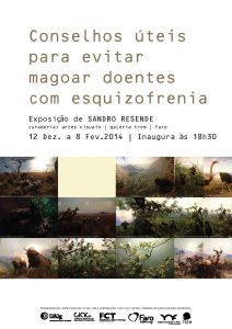 The exhibition “Conselhos úteis para evitar magoar doentes com esquizofrenia” opens on December 12, at 6:30 p.m., at the Trem Gallery, in Faro. The aim of this new exhibition, organised by the Centre for Research in Arts and Communication (CIAC), is to promote the work of artist Sandro Resende, one of the founders of the P28 art project. The exhibition is open until February 08, 2014, from Tuesday to Sunday, from 10:00 a.m. to 6:00 p.m.