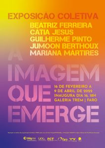 On the 16th February, at 6:00pm, the exhibition A Imagem que Emerge [The image that emerges] opens at Galeria Trem, in Faro. Until 9th April 2022, the collective exhibition features works by Beatriz Ferreira, Cátia Jesus, Guilherme Pinto, Jumoon Berthoux and Mariana Mártires, five artists from UAlg’s Visual Arts degree.