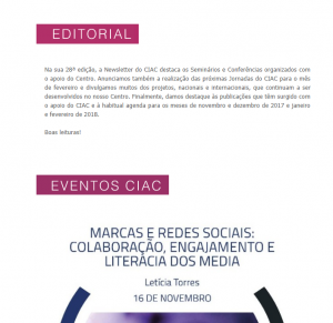 In its 28th edition, the CIAC Newsletter highlights the Seminars and Conferences organized with the support of the Center. We also announce the holding of the next CIAC “Jornadas” for the month of February and announce many of the national and international projects that continue to be developed in our Center. Finally, we highlight the publications that have appeared with the support of CIAC and the usual agenda for the months of November and December 2017 and January and February 2018.