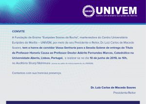 CIAC is pleased to inform that Professor and researcher Adérito Fernandes Marcos, Full Professor at the Open University of Portugal, CIAC researcher, member of the board of directors, founder and current director of the CIAC-UAb polo , will be distinguished with the title Professor Honoris Causa by the University Center Euripides de Marília – UNIVEM, in Brazil. The title attribution session is scheduled for 10 June at 10:00 am at the Shunji Nishimura Auditorium at UNIVEM.