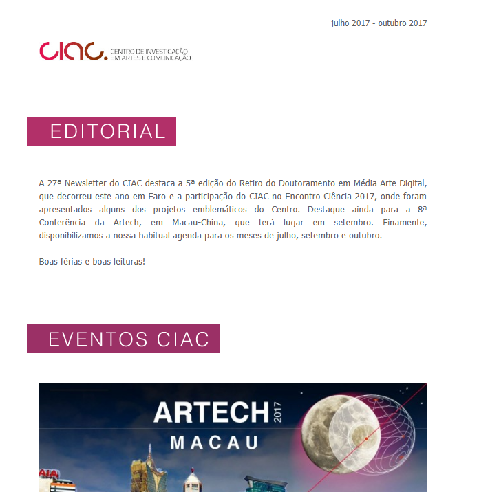 A 27ª Newsletter do CIAC destaca a 5ª edição do Retiro do Doutoramento em Média-Arte Digital, que decorreu este ano em Faro e a participação do CIAC no Encontro Ciência 2017, onde foram apresentados alguns dos projetos emblemáticos do Centro. Destaque ainda para a 8ª Conferência da Artech, em Macau-China, que terá lugar em setembro. Finamente, disponibilizamos a nossa habitual agenda para os meses de julho, setembro e outubro.