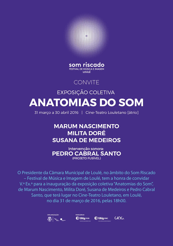Inaugura, no dia 30 de março, pelas 18h00 no âmbito do Festival Som Riscado – Festival de Música e Imagem de Loulé, a exposiçaõ coletiva Anatomias do Som com trabalhos de Marum Nascimento, Milita Doré, Susana de Medeiros e intervenção sonora de Pedro Cabral Santo.
