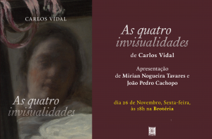 No próximo dia 26 de novembro, pelas 18h00, a coordenadora do CIAC Mirian Tavares apresenta o mais recente livro de Carlos Vidal, intitulado As quatro invisualidades, na Brotéria, em Lisboa. Integrado na coleção Sanguínea das Edições do Saguão, trata-se de um livro que pretende expor um novo entendimento da pintura e das artes visuais que se projetam na música (arte noturna em Jankélévich), levando as artes ao campo de todos os sentidos.