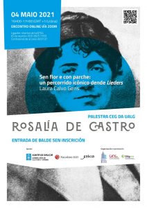 Na próxima terça-feira, 4 de maio, pelas 16h00, terá lugar a palestra online “Sen flor e con parche: un percorrido icónico dende Lieders” com Laura Calvo Gens, que pretende destacar a representação nas artes da poetisa galega Rosalía de Castro.