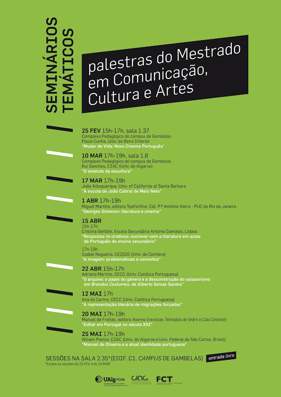 O Ciclo de Seminários Temáticos do Mestrado em Comunicação, Cultura e Artes acolhe, no dia 15 de abril, duas convidadas: entre as 15h00 e as 17h00, Cristina Serôdio, Professora na Escola António Damásio, em Lisboa, proferirá a palestra: “Respostas re-creativas: escrever com a Literatura em Aulas de Português do Ensino Secundário” e mais tarde, entre as 17h00 e as 19h00, Isabel Nogueira, da Universidade de Coimbra, falará sobre “A Imagem: problemáticas e conceitos”.