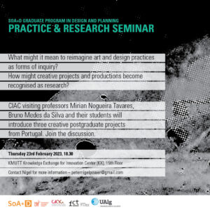 No próximo dia 23 de fevereiro de 2023, os investigadores do CIAC Ana Perfeito, Alexandre Martins e Susana Costa, juntamente com os coordenadores do Centro Mirian Tavares e Bruno Mendes da Silva, apresentam as suas experiências de investigação e prática artística no Practice & Research Seminar, promovido pela KMUTT – King Mongkut’s University of Technology Thonburi (Bangkok, Tailândia).