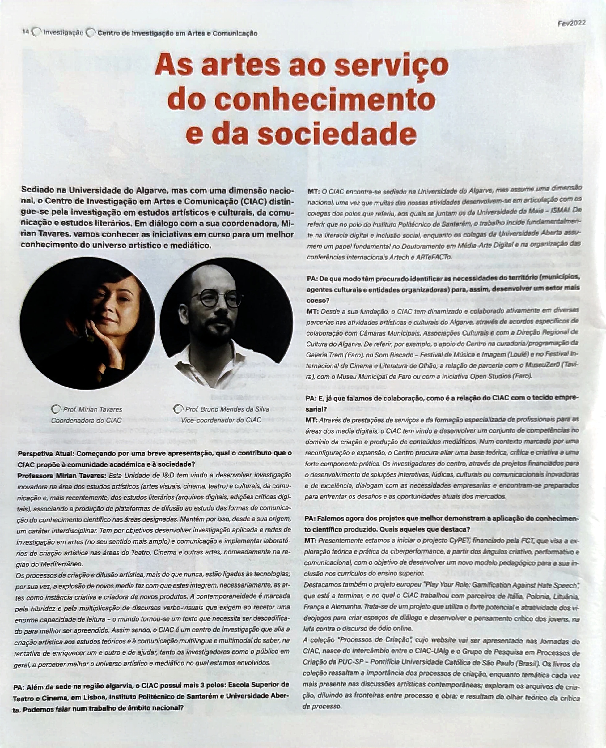 A 16ª edição do suplemento Perspetiva Atual (Jornal SOL) inclui uma entrevista a Mirian Tavares e Bruno Mendes da Silva, coordenadora e vice-coordenador do CIAC. Publicada recentemente, a entrevista dá a conhecer os objetivos e linhas de investigação do Centro, os seus projetos e a sua posição na comunidade académica e na sociedade.