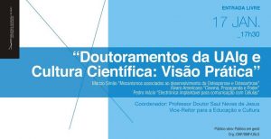 No próximo dia 17 de janeiro, pelas 17h30, realizar-se-ão as palestras dos finalistas de doutoramento Pedro Inácio, Márcio Simão e Álvaro Americano, no âmbito da iniciativa “Doutoramentos da UAlg, Inovação Pedagógica e Cultura Científica: Visão Prática”, coordenada pelo Vice-reitor para a Educação e Cultura, Saúl Neves de Jesus.