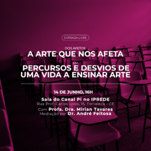Hoje, pelas 20h00 (hora de Lisboa), a coordenadora do CIAC Mirian Tavares ministra a palestra “Dos afetos: a arte que nos afeta ou percursos e desvios de uma vida e ensinar arte”, a convite do projeto Álacre – Laboratório de Literatura e Afetos, do Instituto de Cultura e Artes da Universidade Federal do Ceará (UFC). O evento decorre no IPREDE – Instituto de Primeira Infância, em Fortaleza (Brasil), com coordenação de Cavalcante Junior (ICA/UFC) e mediação de André Feitosa (Universidade de Coimbra).