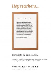 Inaugura no próximo dia 12 de outubro, pelas 18h30, a exposição Hey teachers… de Sara e André, na Galeria Trem. Esta exposição, a abrir o ano letivo 2017/2018, faz parte da programação do curso de Artes Visuais da FCHS/UAlg, para a Galeria Trem, em Faro, e conta, como habitualmente, com o apoio do CIAC, da FCT, da Câmara Municipal de Faro e, desta vez, com a parceria do Hostel 1878.
