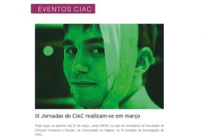 O CIAC informa que já se encontra disponível a 20ª newsletter. Nesta edição damos especial destaque à realização da 7ª Conferência Internacional sobre Artes Digitais – ARTECH 2015, à vinda de André Parente à Universidade do Algarve e à realização das IX Jornadas do CIAC.