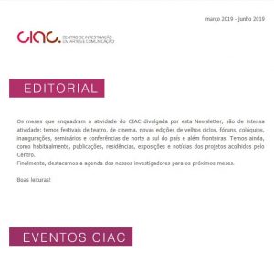 Os meses que enquadram a atividade do CIAC divulgada por esta Newsletter são de intensa atividade: temos festivais de teatro e de cinema, novas edições de velhos ciclos, fóruns, colóquios, inaugurações, seminários e conferências de norte a sul do país e além fronteiras. Temos ainda, como habitualmente, publicações, residências, exposições e notícias dos projetos acolhidos pelo Centro. Finalmente, destacamos a agenda dos nossos investigadores para os próximos meses.