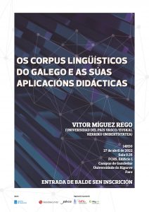 Ministrada pelo professor-leitor Vítor Míguez Rego (Universidad del País Vasco/Euskal Herriko Unibertsitatea), a palestra pretende apresentar os corpus linguísticos da língua galega na atualidade e mostrar a sua aplicabilidade e utilidade na aprendizagem. Será dada especial atenção ao Corpus de textos galegos escritos por estudantes no ámbito académico (CORTEGAL).
