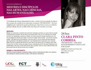 O Ciclo de Palestras “Mestres e Discípulos nas Artes, nas Ciências, nas Humanidades” recebe no próximo dia 28 de junho, pelas 11h00, no Salão Nobre dos Paços do Concelho, em Loulé, Clara Pinto Correia. A professora, bióloga, escritora e historiadora de ciência ministrará a palestra “HETERODOXY . The next enlightenment could last for good”.