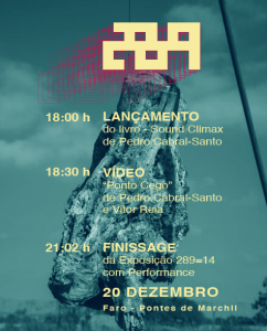 O investigador e artista Pedro Cabral Santo faz o lançamento público do seu mais recente trabalho, Sound Climax, no próximo dia 20 de dezembro, quarta-feira, pelas 18h00, nas instalações da recém-criada Associação 289. De seguida, pelas 18h30 , terá lugar a projecção do vídeo “Ponto Cego” de Pedro Cabral Santo e Vítor Reia-Baptista.