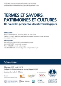 No dia 17 de maio de 2023, entre as 9h00 e as 12h00, o investigador do CIAC Manuel Célio Conceição participa no seminário TERMES ET SAVOIRS, PATRIMOINES ET CULTURES De nouvelles perspectives (eco)terminologiques [Termos e saberes, património e culturas. Novas perspetivas (eco)terminológicas] organizado pelo Observatório de terminologias e políticas linguísticas da Università Cattolica del Sacro Cuore de Milão, em colaboração com o CIAC.