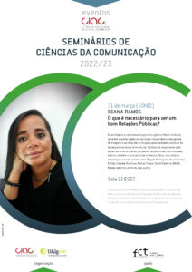 No próximo dia 31 de março de 2023, pelas 10h00, a Escola Superior de Educação e Comunicação (ESEC) da Universidade do Algarve e o CIAC promovem o seminário O que é necessário para ser um bom Relações Públicas?, com Diana Ramos. Organizada no âmbito da unidade curricular de Comunicação Institucional e Relações Públicas, da licenciatura em Ciências da Comunicação, a sessão será moderada pela Professora Carmén Monereo e decorrerá na Sala 22, da ESEC.