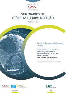No próximo dia 26 de outubro de 2022, entre as 10h30 e as 11h30, a Escola Superior de Educação e Comunicação (ESEC), o Centro de Documentação Europeia da UAlg e o CIAC promovem o seminário Transição digital e inteligência coletiva territorial, com António Covas. Organizada no âmbito das unidades curriculares de Literacia dos Media e Comunicação Estratégica e Marketing, da licenciatura em Ciências da Comunicação, a sessão será moderada pela Prof. Ana Filipa Martins e decorrerá no Anfiteatro 0.5, no Complexo Pedagógico do Campus da Penha.