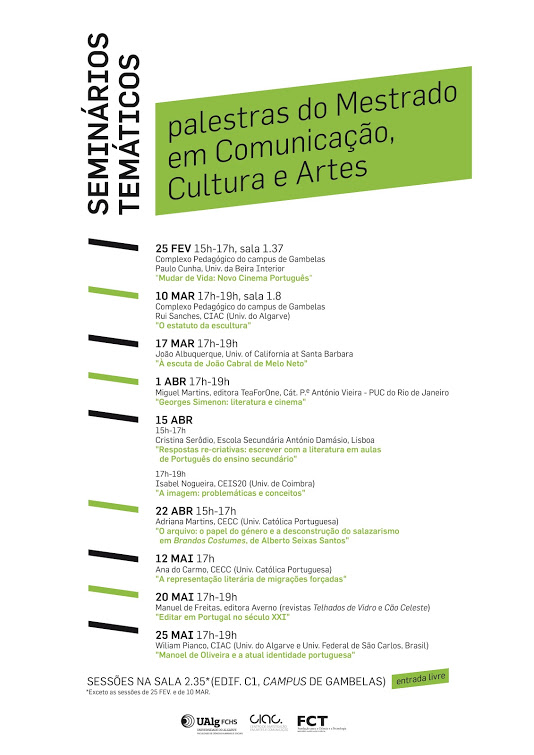 O CIAC, em parceria com a Faculdade de Ciências Humanas e Sociais, promove um ciclo de Seminários Temáticos, ministrados por diferentes palestrantes convidados, no âmbito do Mestrado em Comunicação, Cultura e Artes.