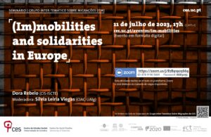 (Im)mobilities and solidarities in Europe faz parte da série de seminários Migração(ões) e Crise Global, organizados pelo Grupo Inter-Temático sobre Migrações (ITM), do Centro de Estudos Sociais da Universidade de Coimbra. Esta série de seminários envolve-se criticamente com a(s) migração(ões) como um fenómeno que é concomitantemente geopolítico e urbano, social, e cultural, bem como tecnologicamente determinado por vários regimes interoperacionais de vigilância biopolítica.